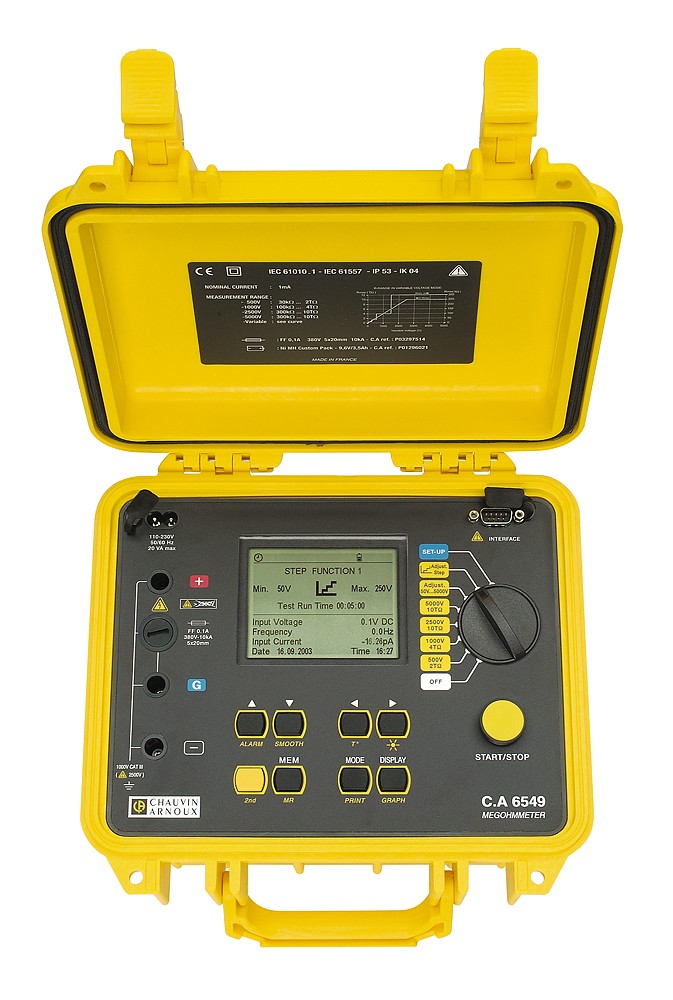 Der Isolationsprüfer C.A 6550 ist in seinem baustellentauglichen Gehäuse bestens geeignet für die Isolationsprüfung von Geräten in der Fertigung, bei turnusmäßigen Prüfungen oder bei der Wieder-Inbetriebnahme von Anlagen. Das Gerät ist besonders für Elektrizitätsversorger, Anlagenhersteller, Installateure, Wartungsbetriebe, Forschungszentren und Infrastrukturbetriebe gedacht.Der C.A 6550 erfüllt die Norm IEEE 43. Diese fordert, dass Isolationsprüfungen an mit 12 kV und darüber versorgten drehenden Maschinen mit Prüfspannungen zwischen 5 und 10 kV vorgenommen werden müssen.