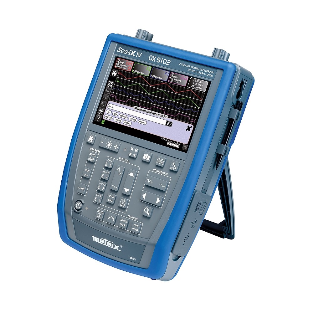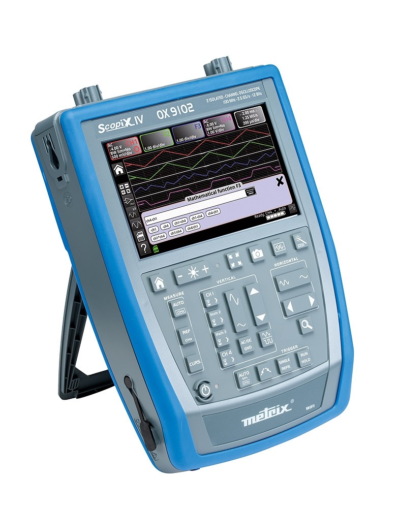 Das OX 9102 ist ein tragbares, netzunabhängiges Digitaloszilloskop der Serie SCOPIX IV der Generation Tablet-Icons mit 2 völlig isolierten Kanälen bis 600 V und mit 100 MHz Bandbreite. Die Speichertiefe in jedem Kanal beträgt 100 KPunkte, so dass auch sehr lange Signalaufzeichnungen möglich sind.