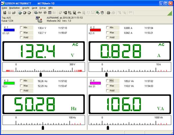 Die Messwerte werden mittels METRAwin 10 von den Multimetern abgerufen, im PC verwaltet und als Yt-, als XY-Diagramm (bis 6 Kanäle) bzw. in Tabellenform (bis 10 Kanäle) dargestellt. Im Online-Betrieb werden die Messdaten auf bis zu vier virtuellen Zeigerinstrumenten bzw. Digitalanzeigen (mit einstellbaren Grenzwerten) angezeigt. Die leistungsfähige Online-Arithmetik ermöglicht Auswertung und Analyse der Daten. Die Abtastung ist - abhängig vom Multimetertyp und Messfunktion - in weiten Bereichen einstellbar. Die Messdaten können als ASCII-Datei exportiert oder über die Zwischenablage leicht in andere Windows-Applikationen (z. B. Word, Excel) übertragen werden.
