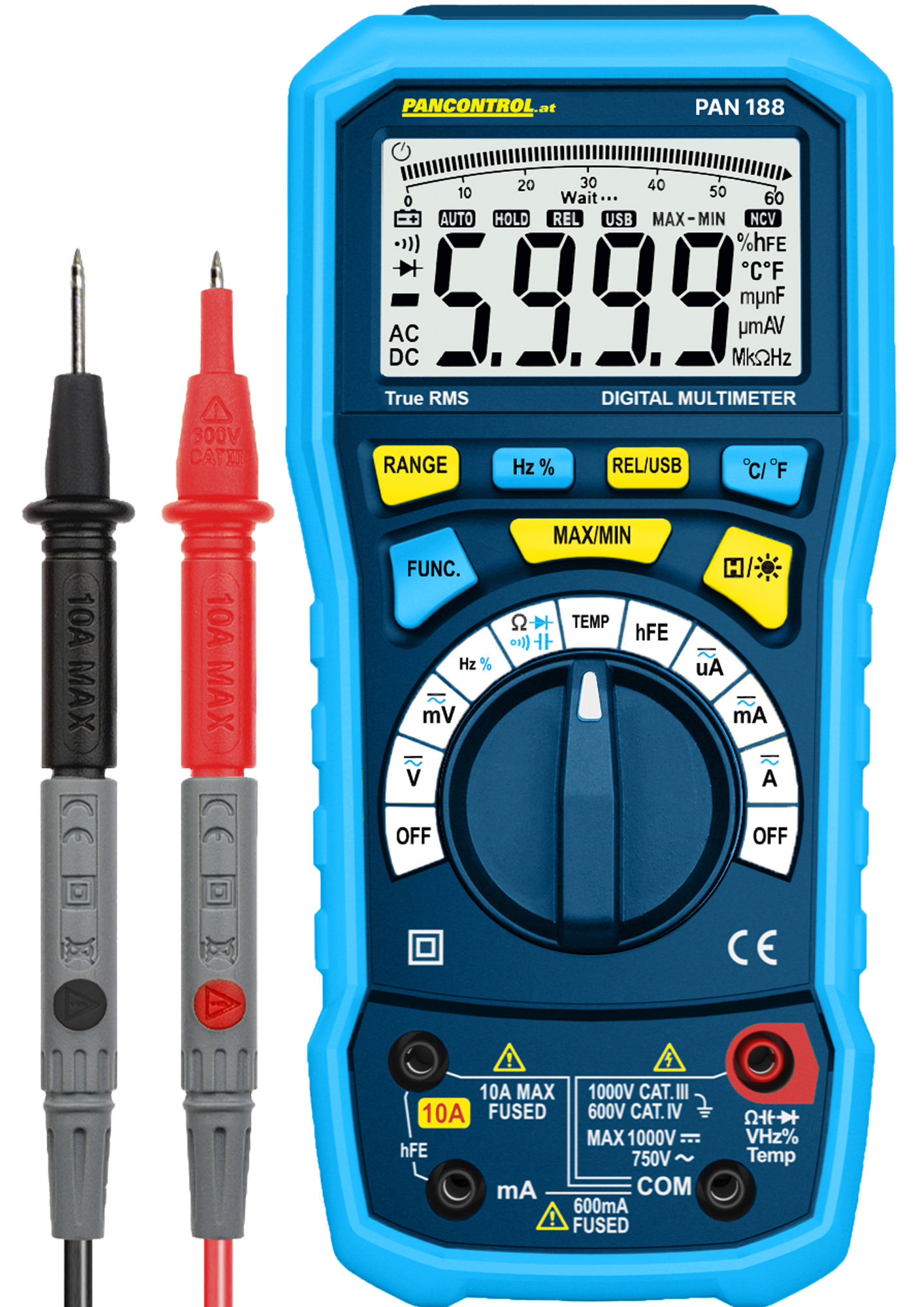 Der PAN 188 misst Spannungen bis 1000 V, Ströme bis 10 A sowie Widerstand, Kapazität, Frequenz, Tastgrad und Temperatur (Typ-K-Fühler inklusive). Dank Data-Hold-Funktion, Hintergrundbeleuchtung und automatischer Abschaltung eignet sich das Gerät besonders für den anspruchsvollen Einsatz unter realen Arbeitsbedingungen.