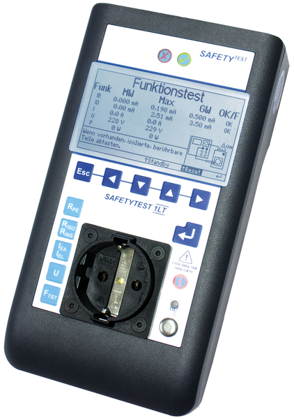 Es enthält alle gängigen Steckdosen zur Prüfung von Drehstromverbrauchern, Wechselstromverbrauchern und Verlängerungsleitungen.Arbeitsmittel mit CEE 16A / 32A Steckern können angeschlossen werden.Der Netzanschluss kann über 400V Drehstrom oder über 230V Schuko-Anschlusskabel erfolgen.Die Bedienung erfolgt menügeführt über eine große, hinterleuchtete LCD-Anzeige.Zu jeder Messung werden Piktogramme als Hilfestellung zum Anschluss und Prüfablauf angezeigt.Vor der Prüfung erfolgt eine Klassifizierung des Prüflings zur Definition des Prüfablaufes und der Einstellung der Grenzwerte nach der gewählten VDE-Vorschrift (z. B. Heizleistung, Anschlussleitungslänge).Für einen effizienten Prüfablauf sind separate Abläufe für Verlängerungsleitungen (optional mit RCD´s), Schweißgeräte (optional) und fest angeschlossene Geräte vorhanden.Die Messwerte werden automatisch im Gerät gespeichert und können anschließend über den PC protokolliert werden oder in eine optionale Prüfmanagement- oder Datenbanksoftware per USB-Kabel, USB Stick oder Bluetooth (optional) übertragen werden.Die Unterscheidung der Prüflinge erfolgt über die Vergabe einer eindeutigen Identnummer über die QWERTZ-Tastatur oder einen an der Schnittstelle anschließbaren Barcode-, QR- oder Transponderscanner.Stammdaten mit Parametern zur Bestimmung der Prüfabläufe können vom PC an das Prüfgerät übertragen werden.