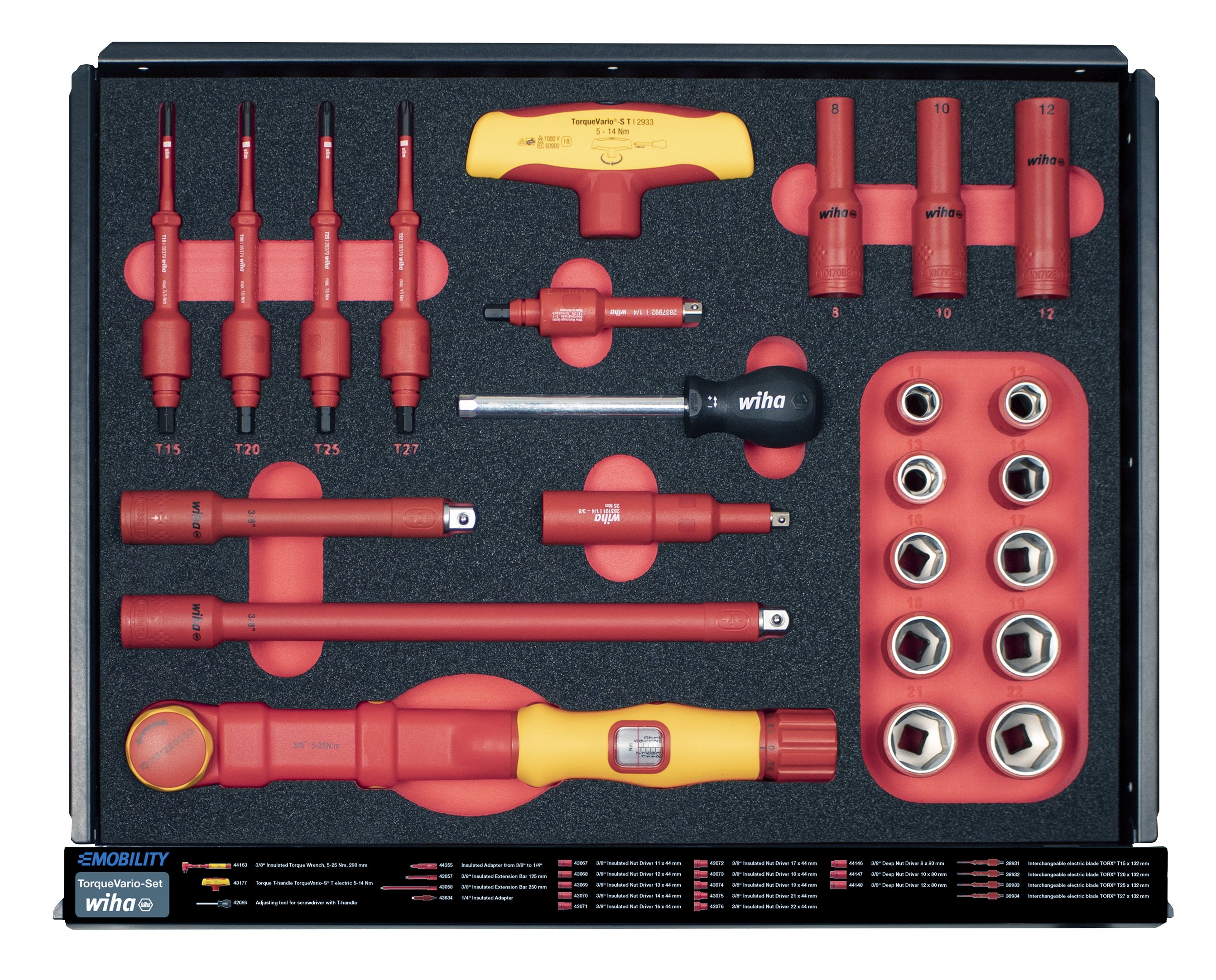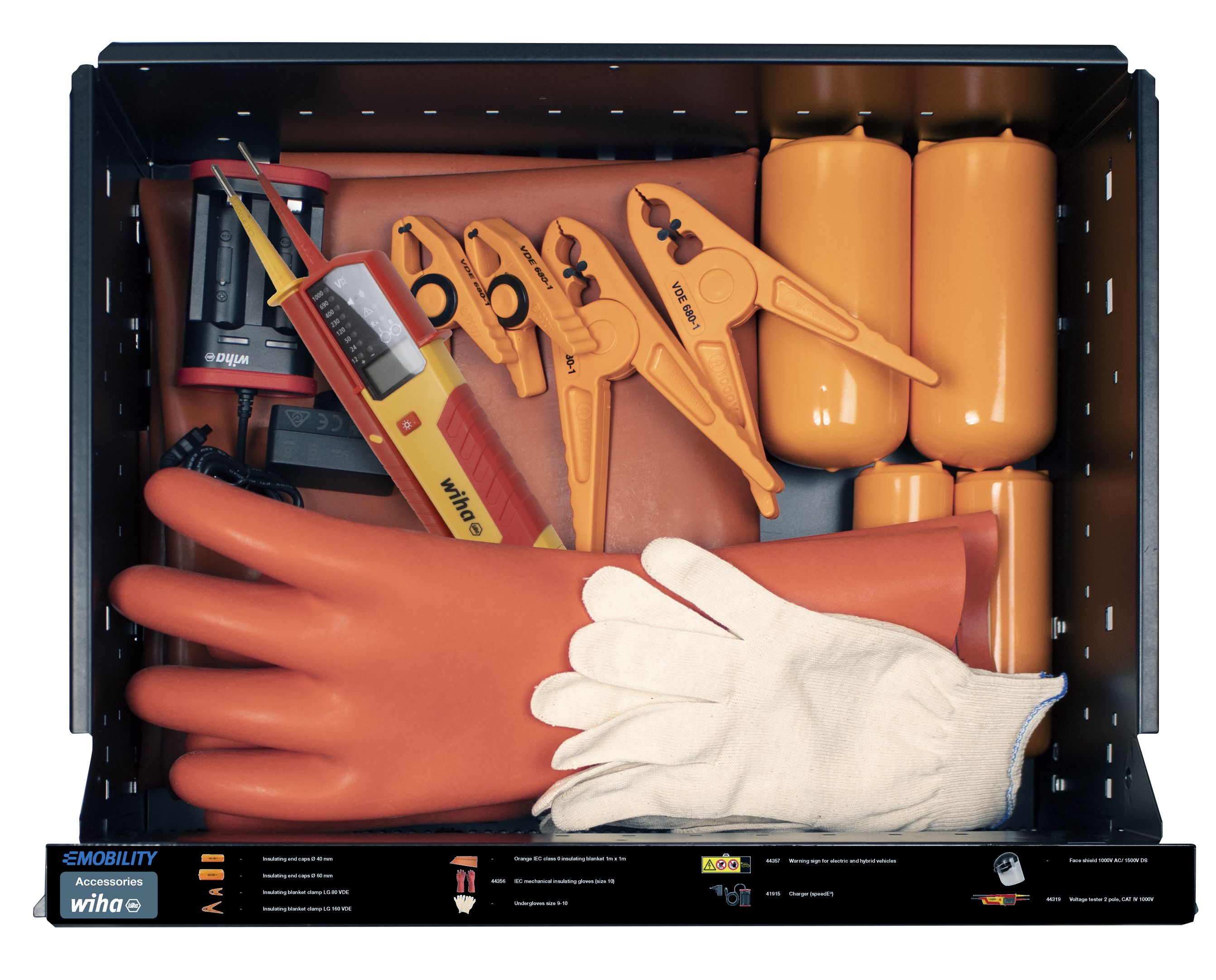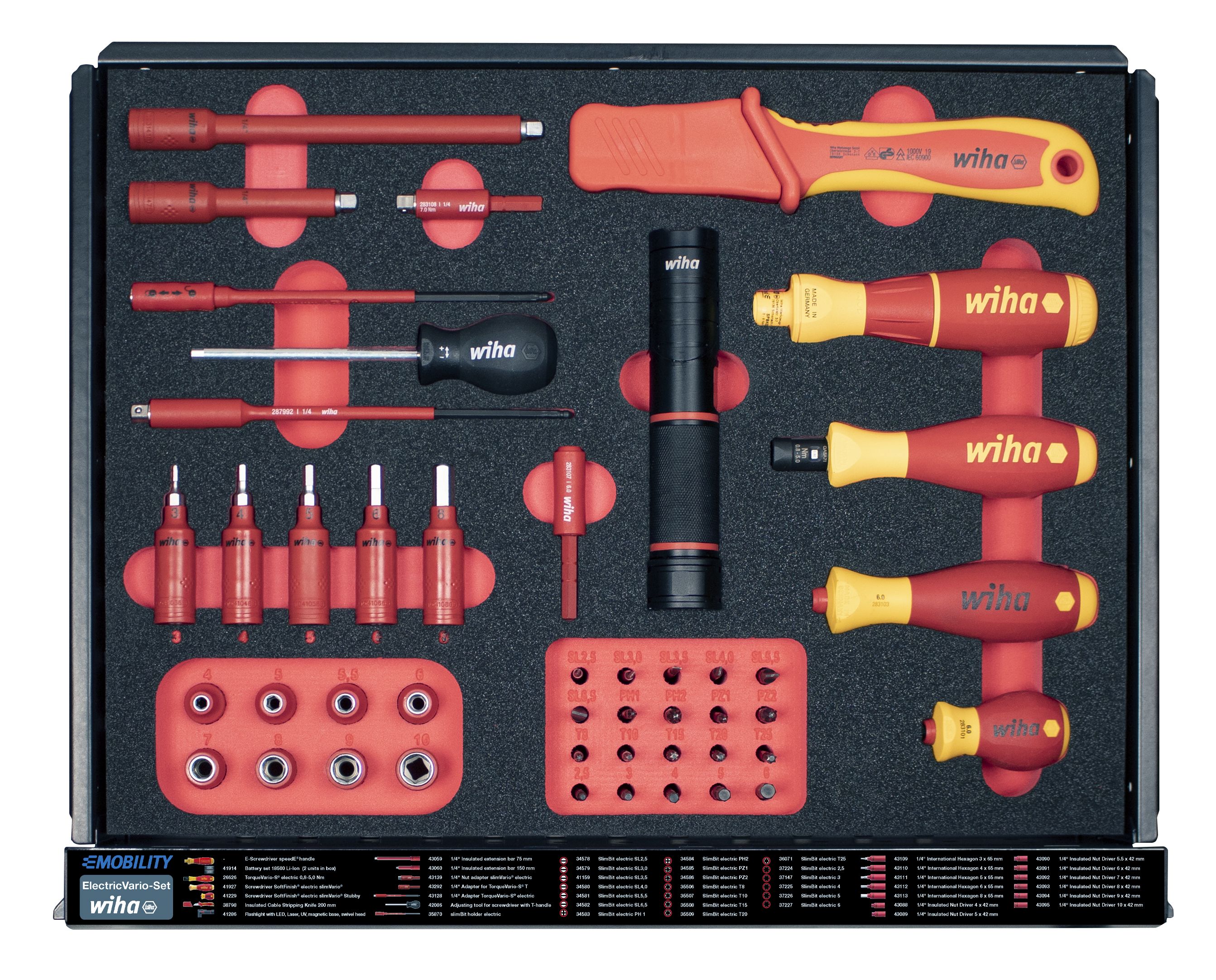 Das Arbeiten an Automobilen mit einem E-Antrieb erfordert besondere Qualifikationen der Mitarbeiter sowie eine sichere, zertifizierte Ausrüstung. Mit dem Werkstattwagen Set eMobility hat der Anwender immer das richtige Werkzeug für die Montage und Reparatur von Hybrid- und Elektrofahrzeugen am richtigen Platz. Kompakt untergebracht sichert der Werkstattwagen dank einer überzeugenden Bestückung an hochwertigen Handwerkzeugen stets das richtige Werkzeug zur Anwendung. Dabei bietet der Großteil der Handwerkzeuge durch Ihre VDE-zertifizierte Isolierung Sicherheit bei Arbeiten an spannungsführenden Teilen. Verteilt auf fünf Schubladen sind die Werkzeuge in passgenauen Schaumstoffeinlagen geschützt und übersichtlich verstaut. Dabei sind die Werkzeuge dank der vollausziehbaren Schubladen jederzeit leicht zugänglich und schnell einsetzbar. Durch zusätzlichen Stauraum und der integrierten 4-fach-Steckdose ist der Wagen individuell, auch mit elektrischen Geräten, erweiterbar. Ein weiterer Vorteil des Werkstattwagens ist die mobile Arbeitssituation dank Rollerkufen, die bis zu 150 kg Inhalt bequem innerhalb der Werkstatt befördern können. Gleichzeitig gewährleisten die Feststeller an den Rollerkufen absolute Stabilität und Standfestigkeit. Somit kann der Werkstattwagen flexibel im mobilen Einsatz, als stabiler Arbeitstisch, sowie als Ablage eingesetzt werden. Vom Spannungsprüfer bis zum Drehmomentschlüssel, von Schutzhandschuhen bis zum Warnschild: Mit dem komplett bestückten Werkstattwagen haben Sie immer das passende Wiha Werkzeug griffbereit.
